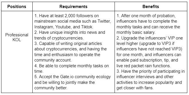 1. The "Gate Influencer Recruitment Posts" program is based on the principle of voluntary registration; Gate will screen the information submitted by the applicants, and the eligible “influencers” will be notified by email and their telegram accounts will be added for further communication.