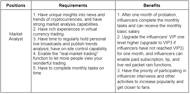 If you have a great interest in cryptocurrencies and would like to share your unique insights that will encourage active communication amongst users in Posts and the Chat Room, then our Influencers project is perfect for you.