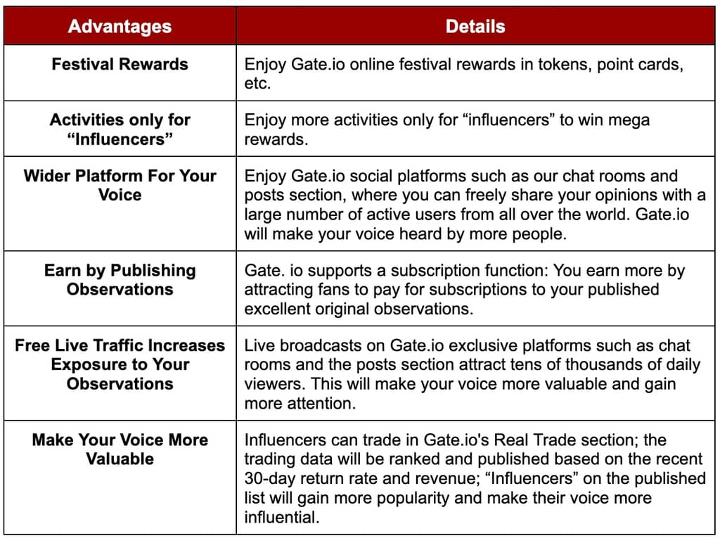 As a Gate Influencer, you can share insights on Gate by creating quality and original content or via live broadcasts. Also, you will receive Gate packages, enjoy services such as traffic sources, trading operations, the latest real-time information, and paid subscriptions.