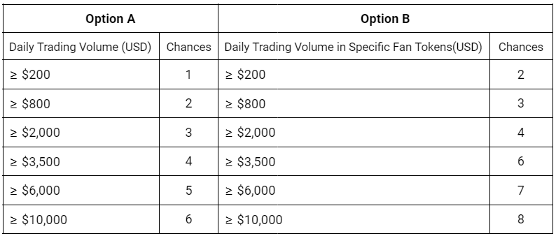 1) The higher trading volume in either Option A or Option B will be evaluated to offer the chances, which can't be accumulated from both of the two situations.