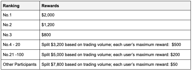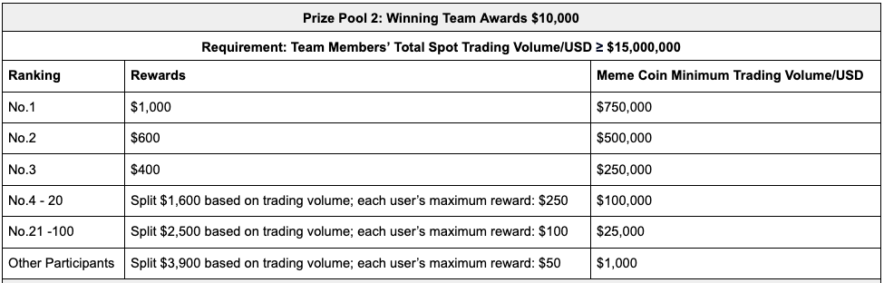 The two teams will compete against each other, based on team members’ total spot trading volume in meme coins of the team. The winning team can win up to $20,000 prizes. Team members of the winning team will split the rewards based on their meme coin spot trading volume.
