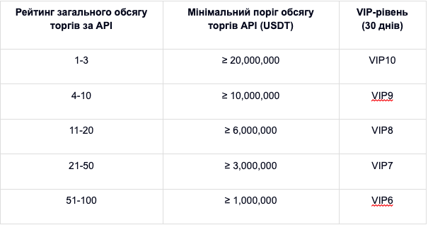 На основі обсягу торгівлі через API протягом періоду проведення події буде складено рейтинг як нових, так і існуючих користувачів, які успішно пройшли реєстрацію. Топ-100 користувачів отримають вищі VIP-рівні.