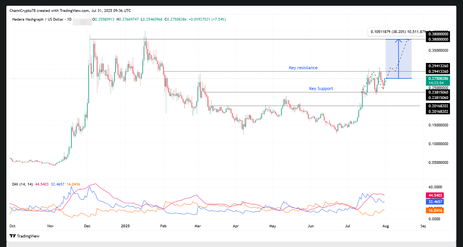 Hedera (HBAR) нещодавно привернула широку увагу через зростання ціни. З підвищенням спекуляцій щодо HBAR ETF, згадкою у звіті Білого дому та припливом інституційного капіталу, ціна HBAR наближається до ключової зони спротиву $0.294. Поєднуючи технічні індикатори та макронаратив, ринковий настрій починає змінюватися в бік бичачого.
