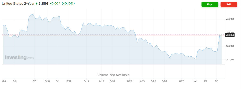 ІнвестуванняОстанні дані про зайнятість підштовхнули 2-річні доходності вверх на 10 базисних пунктів 3 липня, відображаючи зміну очікувань щодо ставок. Але все ж, цей рух був помірним у загальному контексті, і короткострокові доходності залишаються міцно нижчими за свій максимум 6 червня.