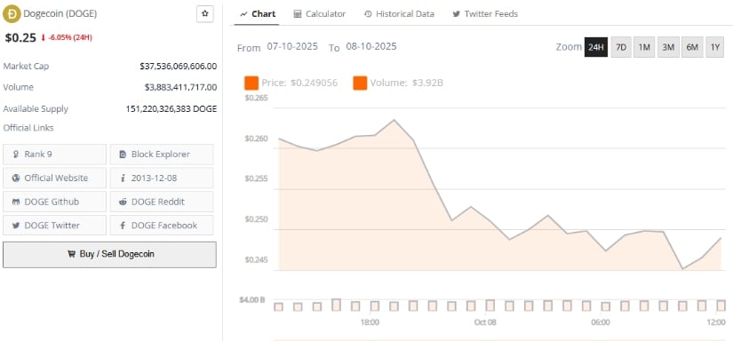 Dogecoin торгувався на рівні близько $0.25, знизившись на 6.05% за останні 24 години на момент публікації. Джерело: Brave New Coin