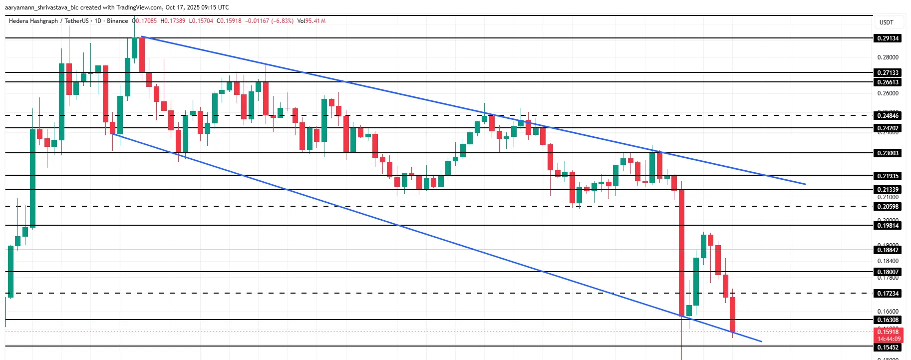 Якщо ведмежий тиск посилиться, HBAR може впасти нижче лінії спадного тренду. Це може призвести до того, що альткоїн впаде нижче $0.154 і націлить на $0.145 у найближчі дні.