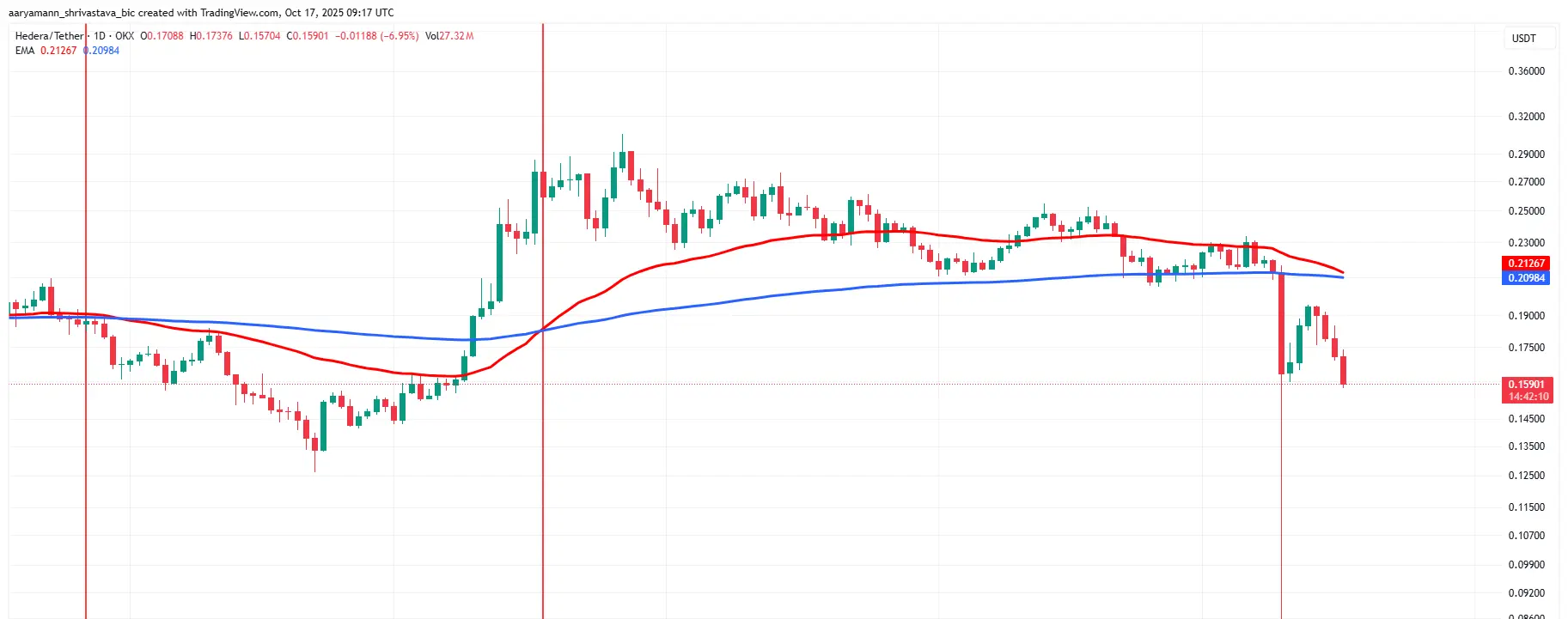 50-денною та 200-денною експоненційними ковзаючими середніми (EMAs) на межі утворення “Смертельного Хреста”, класичного ведмежого сигналу. Ця подія відбувається, коли 50-денна EMA опускається нижче 200-денної EMA, підтверджуючи зміну структури ринку. Завершений Смертельний Хрест вказуватиме на прискорення ведмежого моментуму для HBAR.