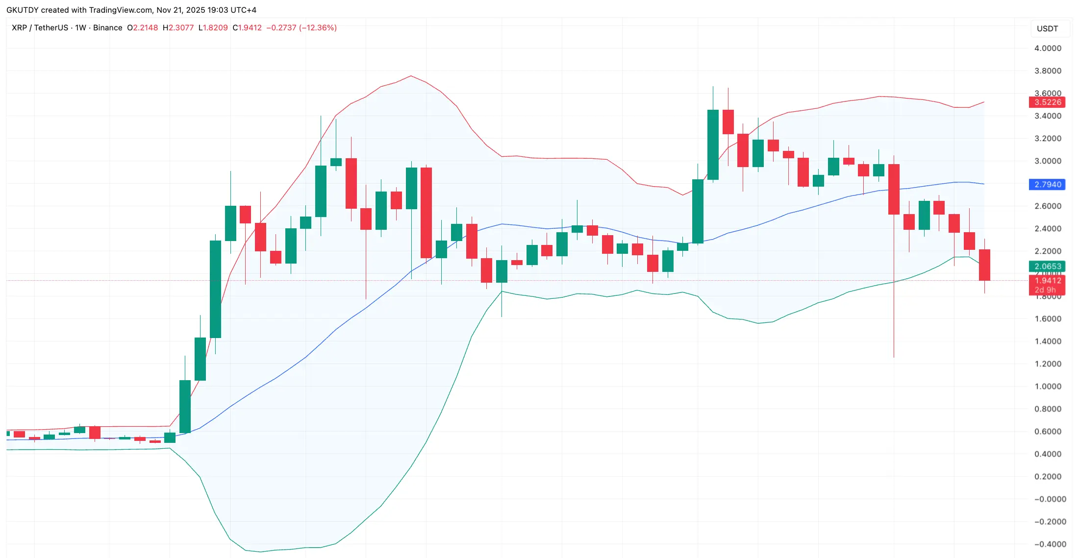Якщо сесії минулого тижня виглядали як односторонній тунель ліквідації для XRP, то графіки вихідних показують зовсім іншу картину, оскільки, поки більшість ринку продовжує діяти так, ніби втрата $2 сигналізує про кінець сюжету, смуги Боллінджера — згідно TradingView — на вищих таймфреймах відмовляються підтверджувати будь-яку з істерій.