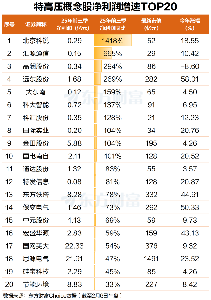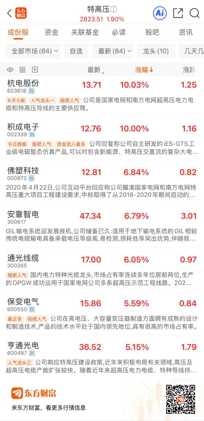 Акції з концепцією надвисокої напруги продовжують бути активними. 6 лютого, акції з концепцією надвисокої напруги відкрилися з падінням і пішли в зростання, станом на ранок закриття сектор піднявся на 1,90%, посівши провідні позиції на ринку. Щодо окремих акцій, Hangdian Shares та Jicheng Electronics встановили максимальні ціни, Fosun Technology, Ankou Smart Electric та Tongguang Cable піднялися більш ніж на 6%, Baobian Electric та Hengtong Optoelectronics — більш ніж на 5%, Zhongtian Technology, Huijin Tong, Huyuan Communications, Zhongchen Shares, Hanlan Shares, Oriental Iron Tower та інші — більш ніж на 4%.