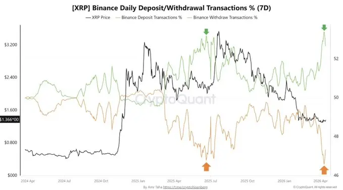 Trung bình bảy ngày cho thấy lượng rút XRP tăng lên 53% trong khi lượng nạp giảm xuống 46%, quay trở lại mức được thấy lần cuối vào tháng 6 năm 2025