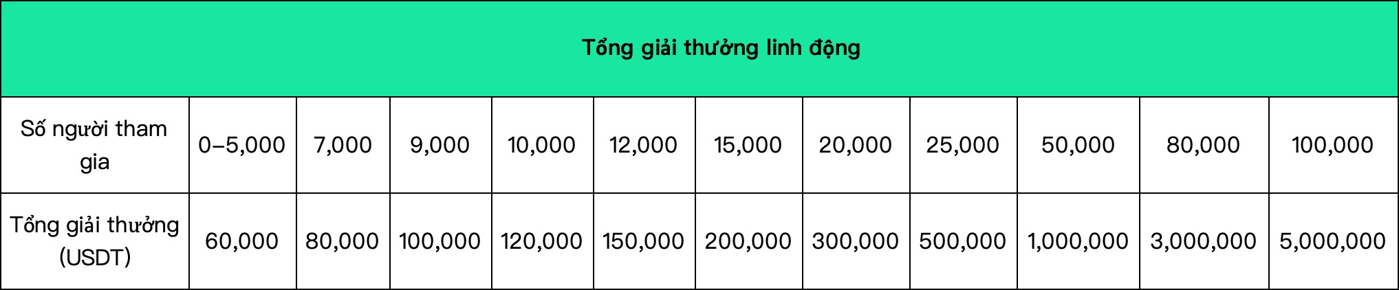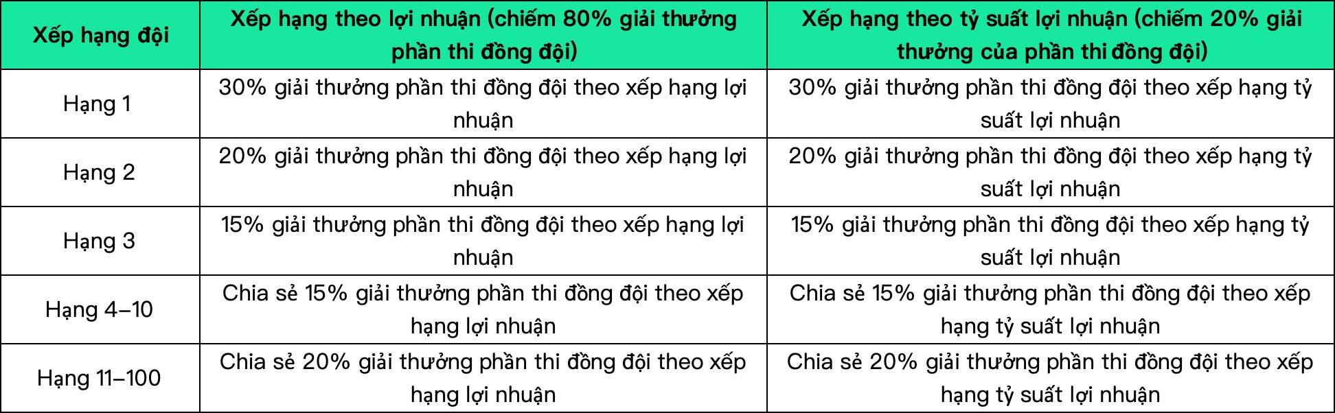 Trong thời gian diễn ra cuộc thi, giải thưởng sẽ được linh động dựa trên số lượng người tham gia. Càng nhiều người tham gia, tổng giải thưởng sẽ càng cao. Trong đó, giải thưởng phần thi đồng đội chiếm 80% tổng giải thưởng và giải thưởng phần thi cá nhân chiếm 20% tổng giải thưởng. Chúng tôi sẽ xếp hạng dựa theo lợi nhuận và tỷ suất lợi nhuận. Trong quỹ giải thưởng phần thi đồng đội và phần thi cá nhân, 80% tổng giải thưởng tương ứng sẽ chia sẻ theo xếp hạng lợi nhuận, và 20% tổng giải thưởng tương ứng sẽ được chia sẻ theo xếp hạng tỷ suất lợi nhuận. Tổng giải thưởng cuối cùng sẽ được xác định bởi số lượng người giao dịch hợp lệ.