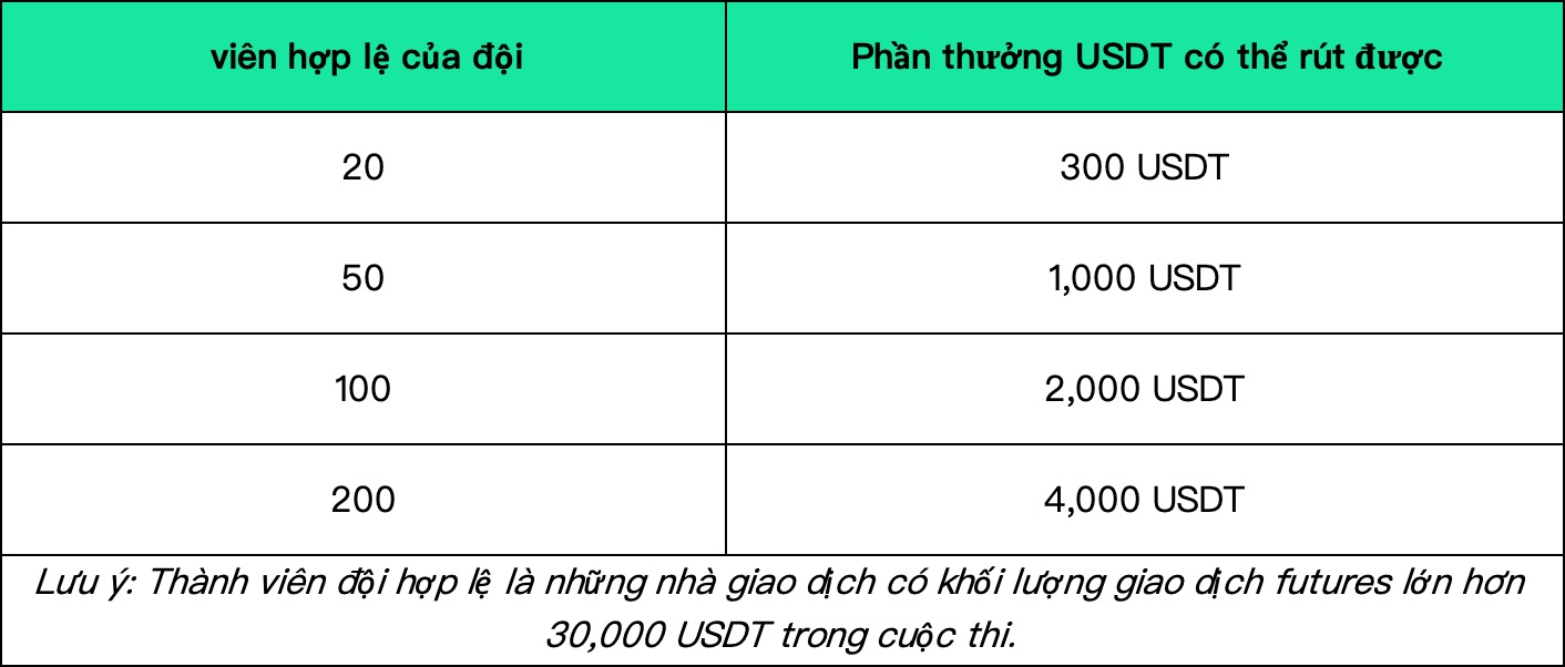 Phần thưởng đóng góp của Đội trưởng: Khi số lượng thành viên hợp lệ của đội đạt đến một quy mô nhất định, Đội trưởng của đội sẽ nhận được phần thưởng USDT bổ sung theo các quy tắc sau: