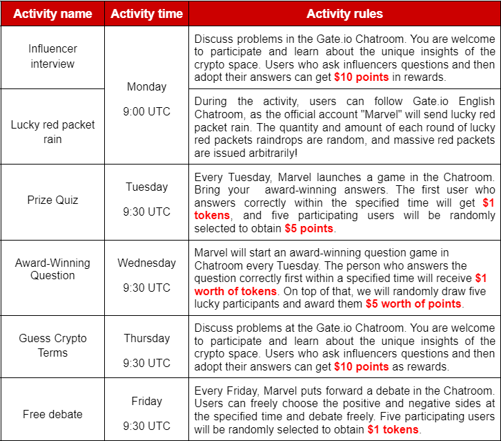 In order to improve users' performance in Gate Chatroom experience and provide better quality service, Gate Chatroom will launch different intriguing interactions with Gate official account "Marvel-N-Wonder" from Monday to Friday. Users who participate in the interaction will have the opportunity to obtain rich rewards. After the interaction, Gate will issue corresponding rewards to the winning users according to the activity rules and award conditions below.
