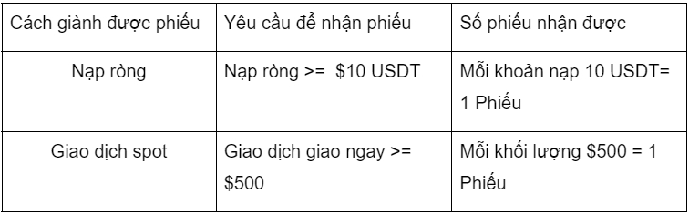 2. Tiền nạp ròng 10 USDT = 1 Phiếu; Khối lượng giao dịch spot $500 = 1 Phiếu.