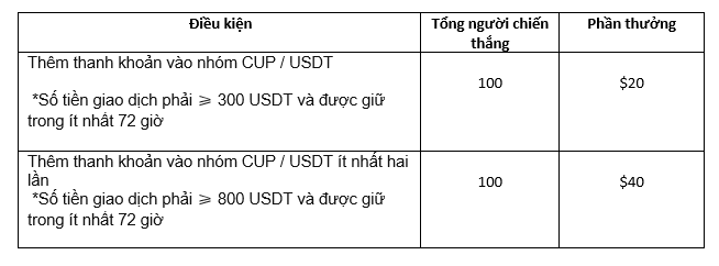 Trong hoạt động này, người dùng đầu tiên cần thêm thanh khoản vào nhóm CUP / USDT và hoàn thành bài kiểm tra trong biểu mẫu. Số tiền giao dịch phải ≥ 100 USDT và được giữ trong ít nhất 48 giờ. Top 100 người tham gia đủ điều kiện có thể chia CUP trị giá 2.000 USD