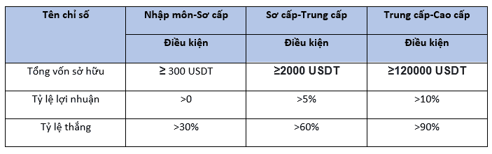 <1> Đối với các nhà giao dịch cùng cấp, trong số sáu chỉ số về [Tổng vốn sở hữu], [AUM], [Tỷ lệ lợi nhuận], [Mức lợi nhuận], [Tỷ lệ hoàn vốn tối đa] và [Tỷ lệ thắng], có 3 và hơn 3 chỉ số được xếp hạng top 3 trong số tất cả các nhà giao dịch cùng cấp, thì có thể được nâng cấp trực tiếp và tự động.