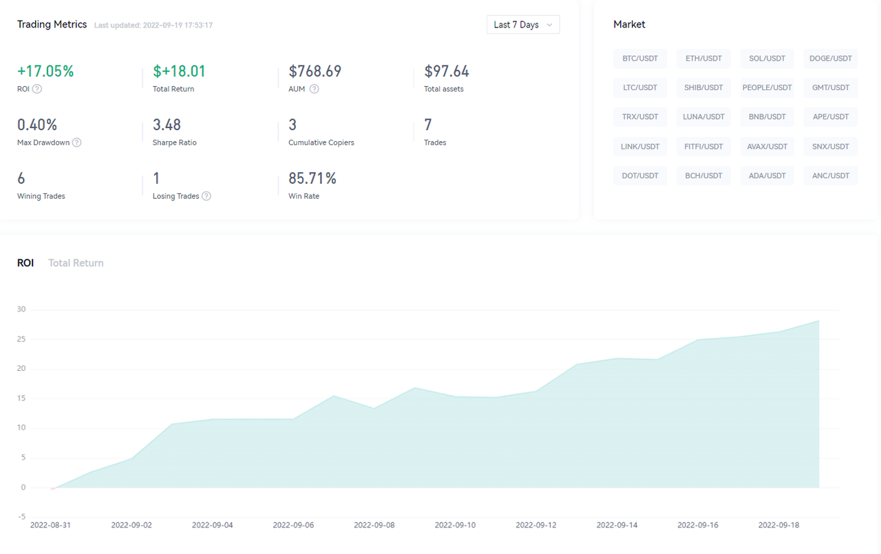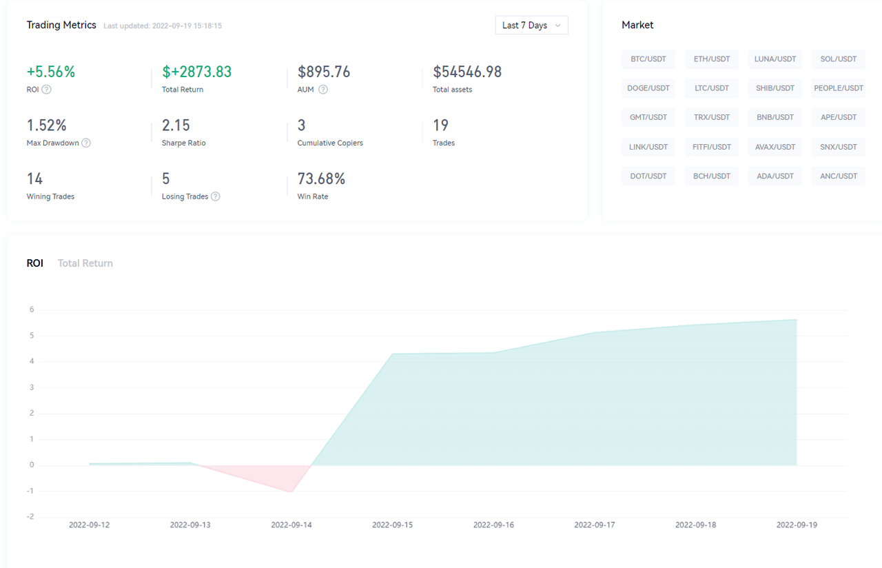 Trader: 大哥牛666 (Win rate: 73.68%; Max drawdown: 1.52%;ROI: 5.56%)