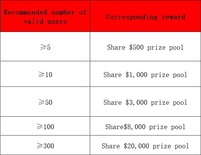 Dựa trên UID đã đăng ký của bạn, chúng tôi sẽ tính những người dùng mới và khối lượng giao dịch mà bạn mang lại trong sự kiện và phân phối phần thưởng cho phù hợp. Phần thưởng như sau: