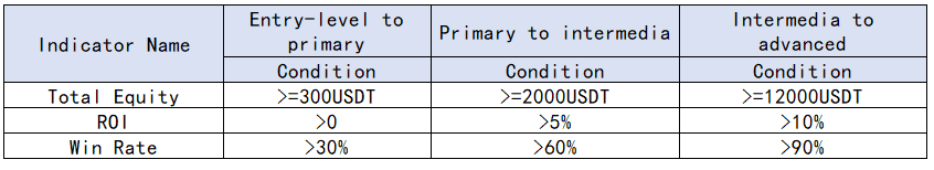 <1> Đối với các nhà giao dịch cùng cấp, trong số sáu chỉ số về [Tổng vốn sở hữu], [AUM], [Tỷ lệ lợi nhuận], [Mức lợi nhuận], [Tỷ lệ hoàn vốn tối đa] và [Tỷ lệ thắng], có 3 và hơn 3 chỉ số được xếp hạng top 3 trong số tất cả các nhà giao dịch cùng cấp, thì có thể được nâng cấp trực tiếp và tự động.