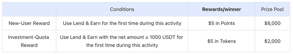 Trong thời gian diễn ra hoạt động, người dùng quản lý tài chính mới tham gia Lend & earn lần đầu tiên có thể nhận được point 5 USD và có thể nhận thêm mã thông báo trị giá 5 USD sau khi hoàn thành số lượng quản lý tài chính được chỉ định, với tổng giải thưởng là 10.000 USD.