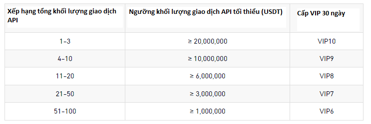 Xếp hạng theo khối lượng giao dịch API của người dùng mới và hiện tại đã đăng ký thành công trong hoạt động và top 100 người đầu tiên có thể nhận được cấp VIP cao.