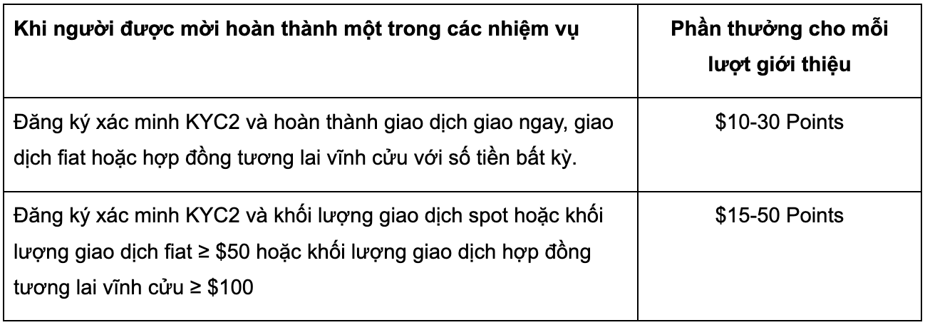 Giới thiệu người dùng mới đăng ký xác minh KYC2 và hoàn thành nhiệm vụ, bạn sẽ giành được phần thưởng và hưởng hoa hồng phí giao dịch lên tới 40% cho mỗi người được mời.