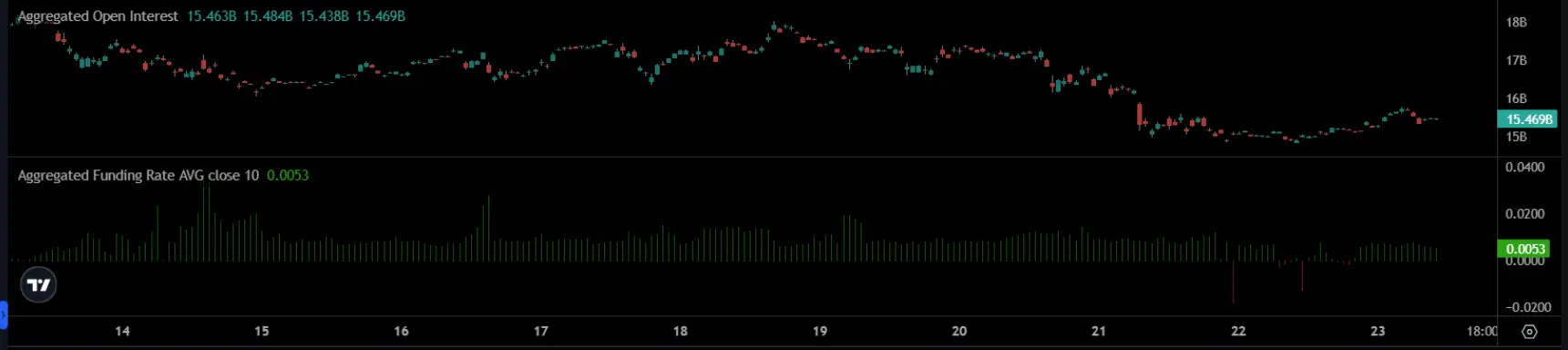 Nguồn: XHợp đồng mở (OI) tổng hợp duy trì quanh 15,46 tỷ USD, chứng tỏ thị trường chưa xuất hiện làn sóng thanh lý mạnh hay áp lực “thoát hàng” ồ ạt. Nếu các trader thực sự hoảng loạn, OI đã giảm sâu, nhưng thực tế lại hoàn toàn trái ngược. Tỷ lệ funding rate hiện chỉ ở mức dương nhẹ 0,0053, cho thấy các trader vẫn nghiêng về vị thế Long, nhưng không quá hung hăng.