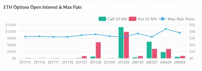 Tổng hợp đồng quyền chọn $11.44B, giảm 3.82% trong 24 giờ. Điểm đau lớn nhất gần đây nằm ở mức $3,200-3,250, tạo ra hiệu ứng nam châm đối với giá.