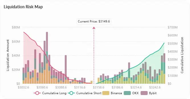 • Rủi ro giảm: Tại khu vực $3,100, tổng cộng có $643 triệu vị thế mua bị thanh lý.