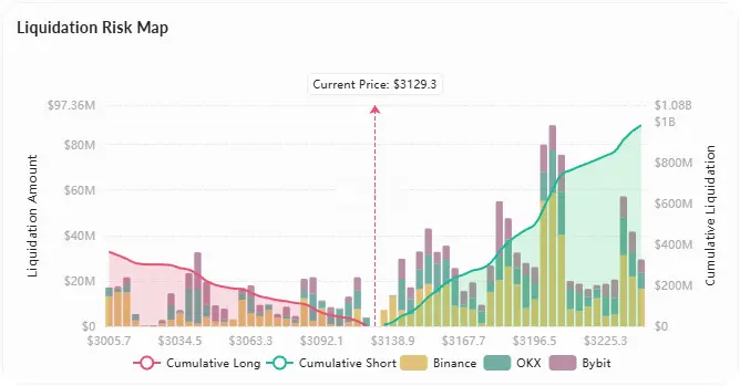 Tổng số tiền thanh lý trong 24 giờ là $169 triệu, trong đó thanh lý lệnh mua là $130 triệu, thanh lý lệnh bán chỉ là $39 triệu, cho thấy áp lực giảm giá chiếm ưu thế. Dưới mức $3,006 có tổng áp lực thanh lý lệnh mua là $364 triệu, trong khi trên mức $3,240 có tổng áp lực thanh lý lệnh bán là $984 triệu.