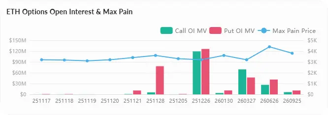Tổng vị thế $11.3B, ngày 17 tháng 11 điểm đau tối đa của quyền chọn nằm ở $3,200, cho thấy có hiệu ứng neo giá mạnh mẽ xung quanh mức giá đó.