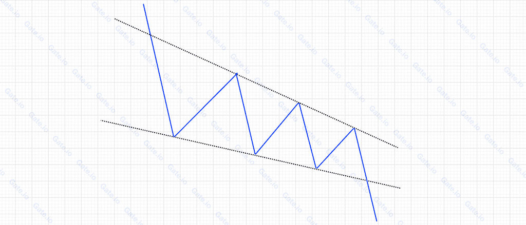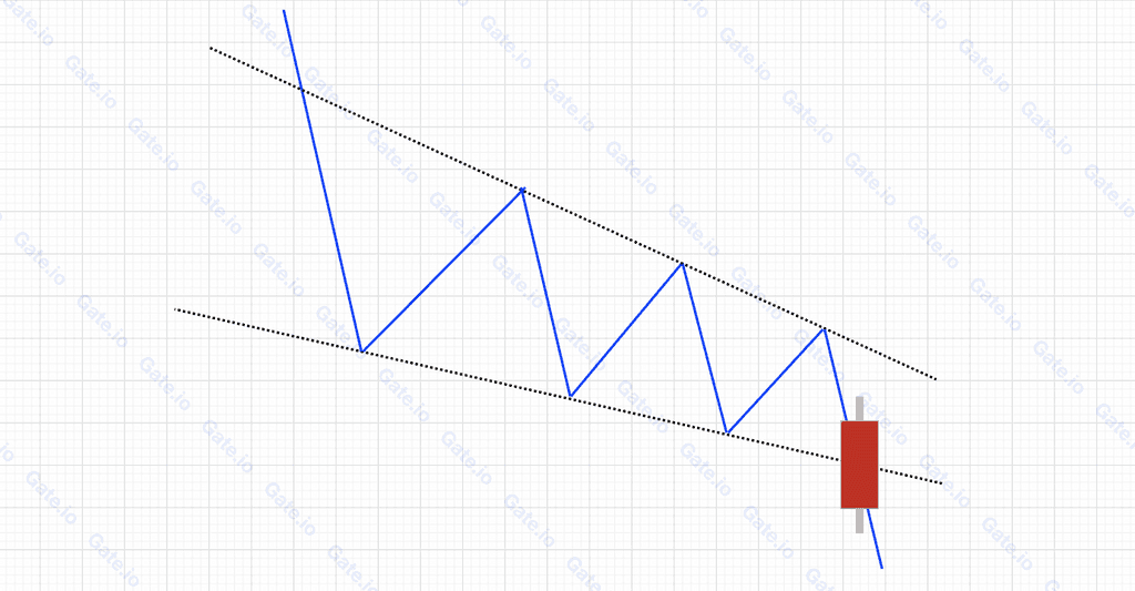 上圖是 Gate合約 BTC/USDT 日線圖。在 2022-5-5 至 2022-6-18 行情中,在一輪急速下跌後,橫盤整理最後走出下降楔形。當幣價跌破楔形的下邊線29,500 美元后,開啟新一輪下跌最低觸及17,800 美元,跌幅高達42%。
