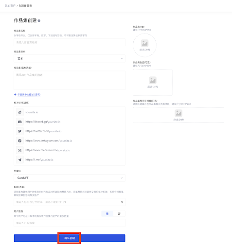 Step 2: 在作品集創建頁面,上傳作品集logo,填寫作品集名稱,從下拉列表中選擇作品集類別,點擊「確認創建」按鈕,即可創建一個全新的 NFT 作品集;當然您也可以通過上傳作品集封面、作品集展示頁橫幅,添加作品集描述、版稅、用戶限購等內容自定義您的 NFT 作品集。
