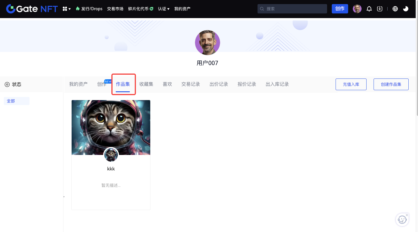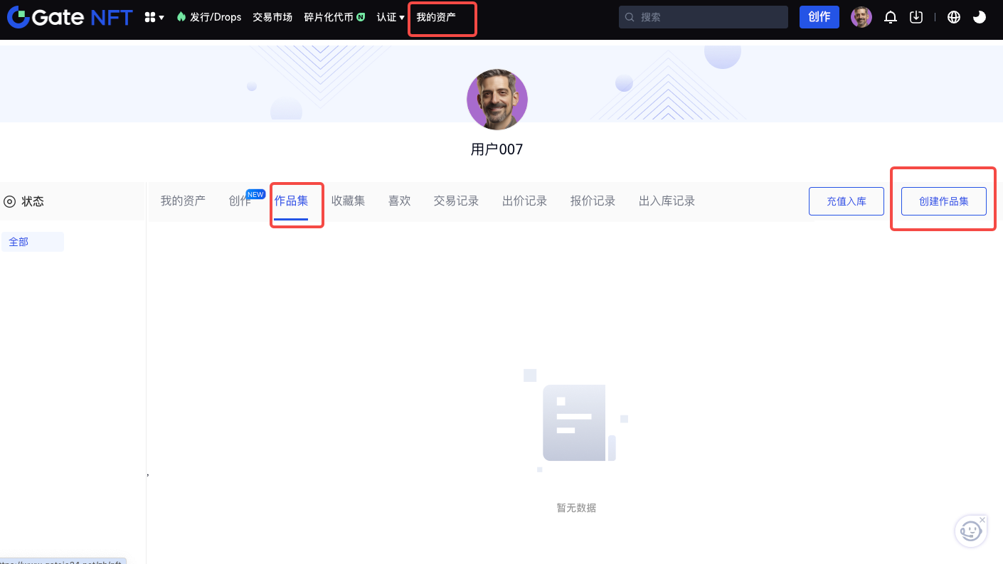 Step 1: 請您進入 Gate NFT 首頁,點擊並進入我的資產頁面作品集列表,點擊「創建作品集」按鈕,即可進入作品集創建頁面。