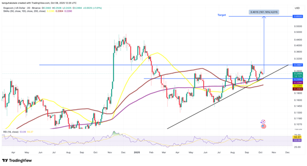 這一模式呼應了過去的上衝行情,在2023-2024年期間使該memecoin上漲了300%,並在2024年底上漲了445%。