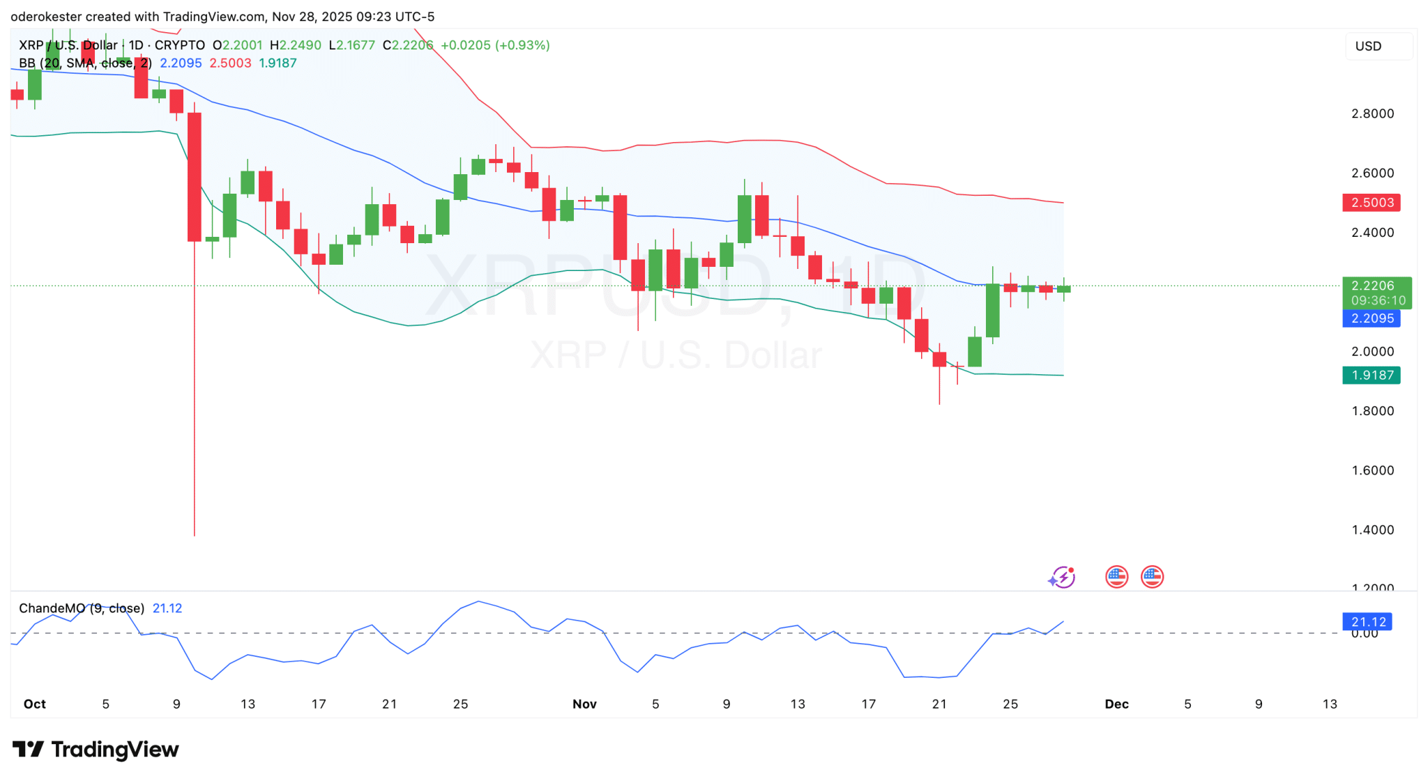 在每日 XRP/USD 圖表上,價格正試圖在持續的 11 月下跌趨勢後穩定下來。XRP 目前的交易價格約爲 $2.22,剛好高於 20 日布林帶中點 $2.21。這意味着多頭在短暫將價格壓低至接近 $1.92 的下軌後,成功重新奪回了均值,而 $1.92 現在作爲關鍵短期支撐。