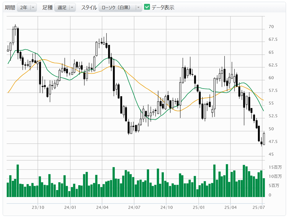 【圖表8】摩爾森·庫爾斯飲料[TAP]:周線圖(移動平均線 綠色:13周,橙色:26周) ! 來源:Monex證券網站(截至2025年7月3日)