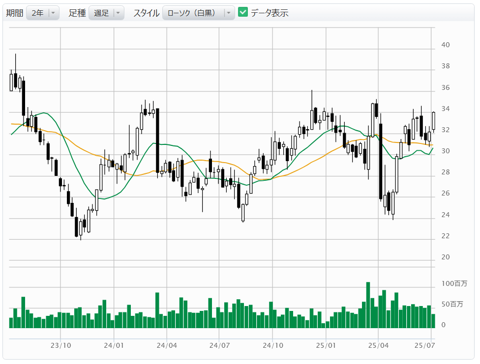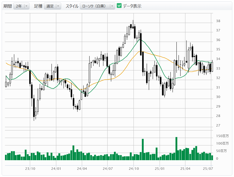 【圖表6】可樂·博士胡椒[KDP]:周線圖(移動平均線 綠色:13周,橙色:26周) ! 來源:マネックス證券網站(截至2025年7月3日)