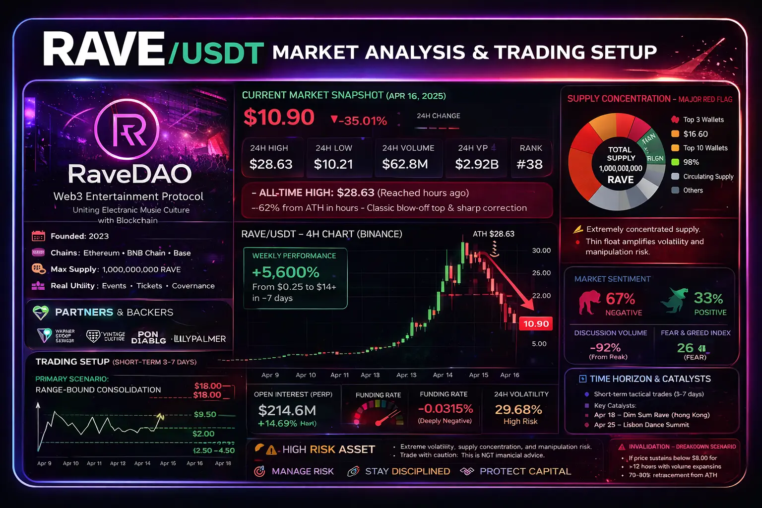 RAVE 目前交易價格約為 $10.90,在過去24小時內劇烈回調了 -35%。該代幣在數小時前曾達到近 $28.63 的歷史高點,隨後經歷了急劇修正。這代表在超過 4,300% 的非凡 30 天漲幅後出現的典型吹頂模式。24 小時交易量約為 $6,280 萬,市值約為 $29.2 億,在所有加密貨幣中排名第38。
