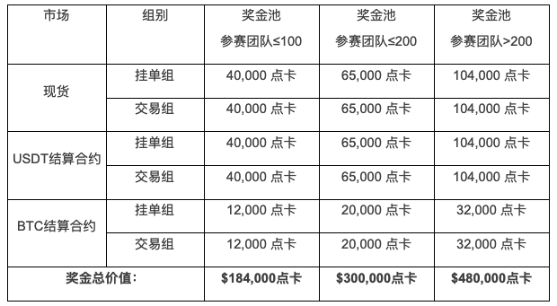 本次比赛分现货、BTC本位和U本位永续合约赛场,并分别设立挂单组与交易组奖项。组内总奖池将依据报名人数呈阶梯式分配;组内排名前 20 名的做市商团队将根据排名瓜分固定比例的奖励,细则如下。