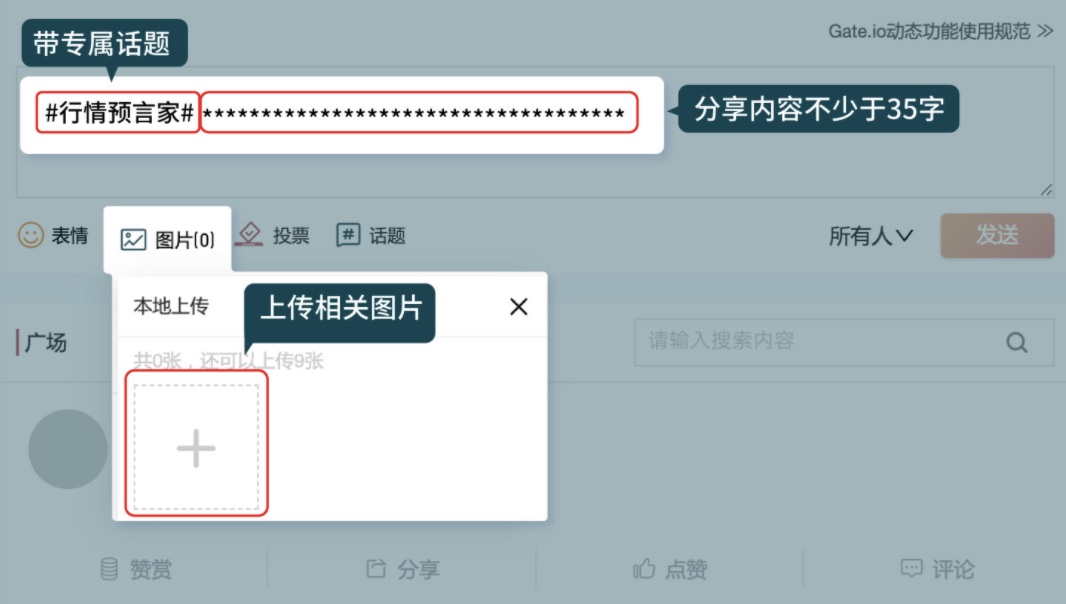 - 除话题字数外,分享内容不少于35字,并需要在动态圈附带相关图片发送。(例如行情走势图、交易截图、加密货币快讯截图等)