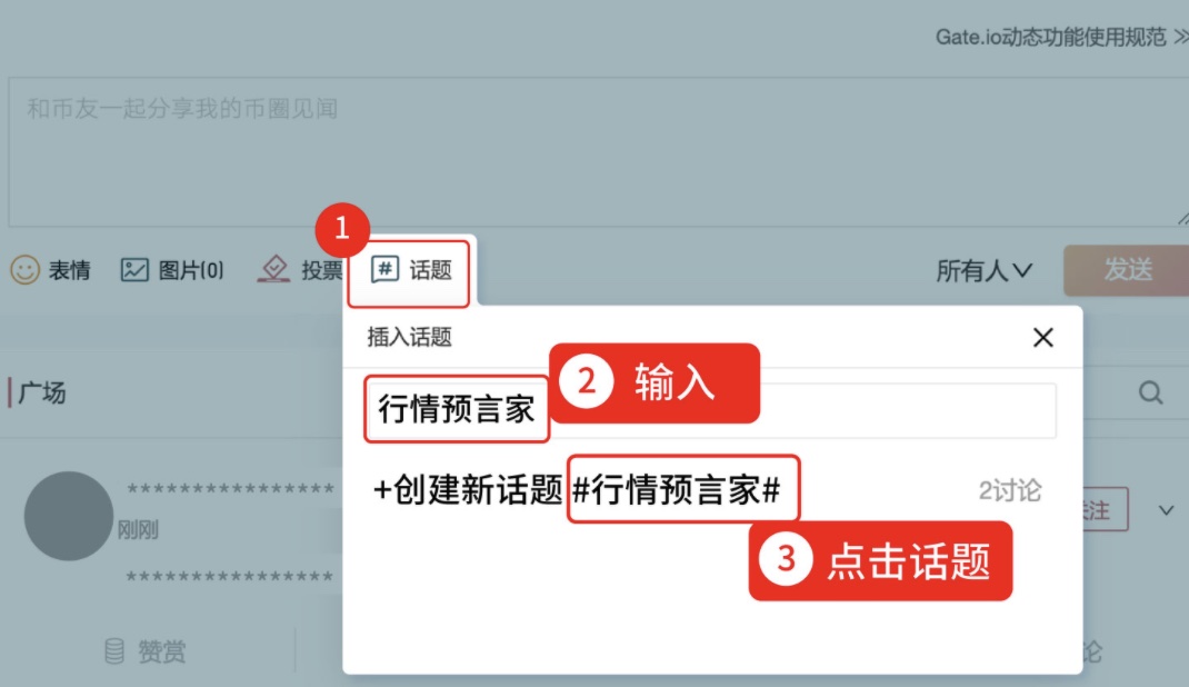 点击“币圈” →“动态”栏目 → 添加“话题”→上传图片→ 输入内容 → 发送