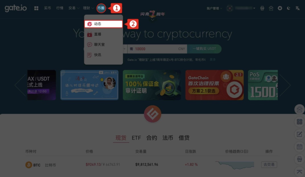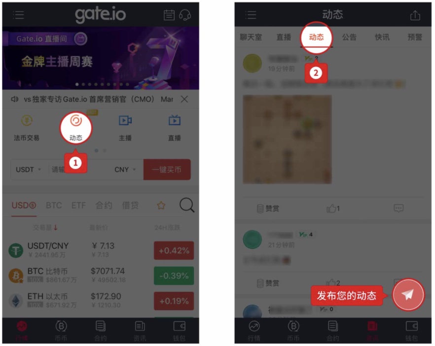 网页/客户端:登录网页端—菜单导航栏选择“币圈”页面,点击动态即可