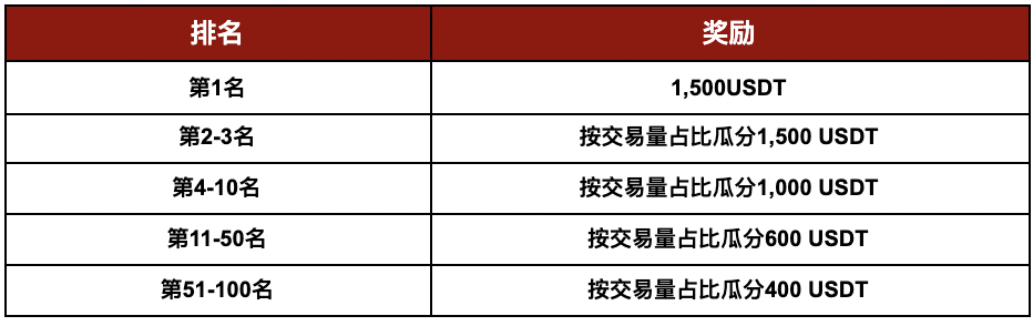 活动期间,平台将在满足活动期间交易额≥200 USDT的用户在 *TRX相关交易对和*BTT相关交易对的总交易额进行排名,获得对应名次的用户将根据交易额占比瓜分对应档位奖励。奖励三的奖池合计5000 USDT,单用户最高奖励1500 USDT。