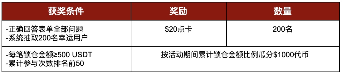 活动期间,学习Gate流动性挖矿帮助文档,点击下方表单回答相关问题,系统将从所有全部回答正确的用户中抽取200名每人奖励$20点卡。