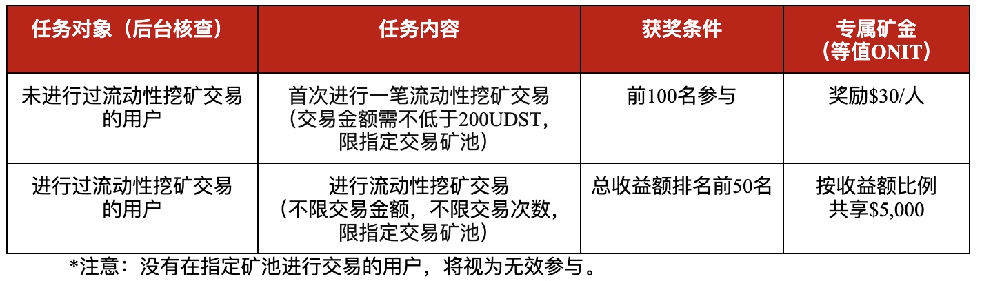 流动性挖矿&借贷挖矿”Telegram交流群 ,并邀请一名好友加入(24小时内退群将视为无效参与);即可获得$10 ONIT福利金,总奖池$1,000,先到先得,送完即止。