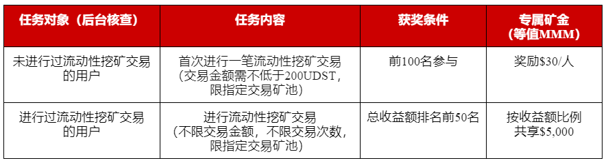 活动期间加入“流动性挖矿&借贷挖矿”Telegram交流群 ,并邀请一名好友加入(24小时内退群将视为无效参与);即可获得$10 MMM福利金,总奖池$1,000,先到先得,送完即止。