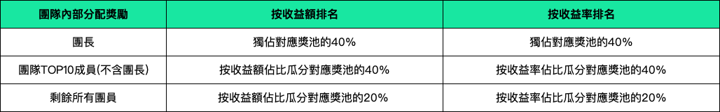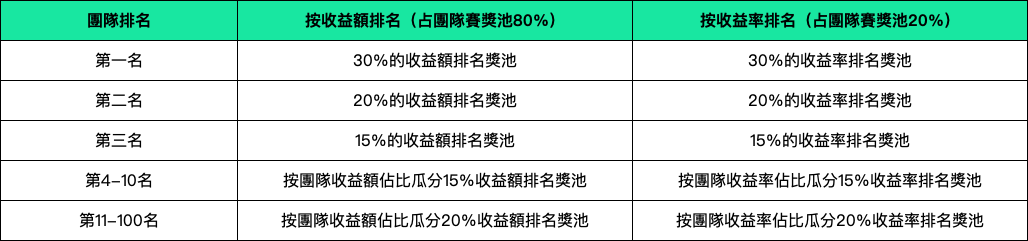 (一)、活动期间,根据参赛团队的收益额和收益率在团队之间分别进行排名,其中按收益额排名的占团队赛奖池的80%,收益率排名的占团队赛奖池的20%,团队赛具体奖励规则如下: