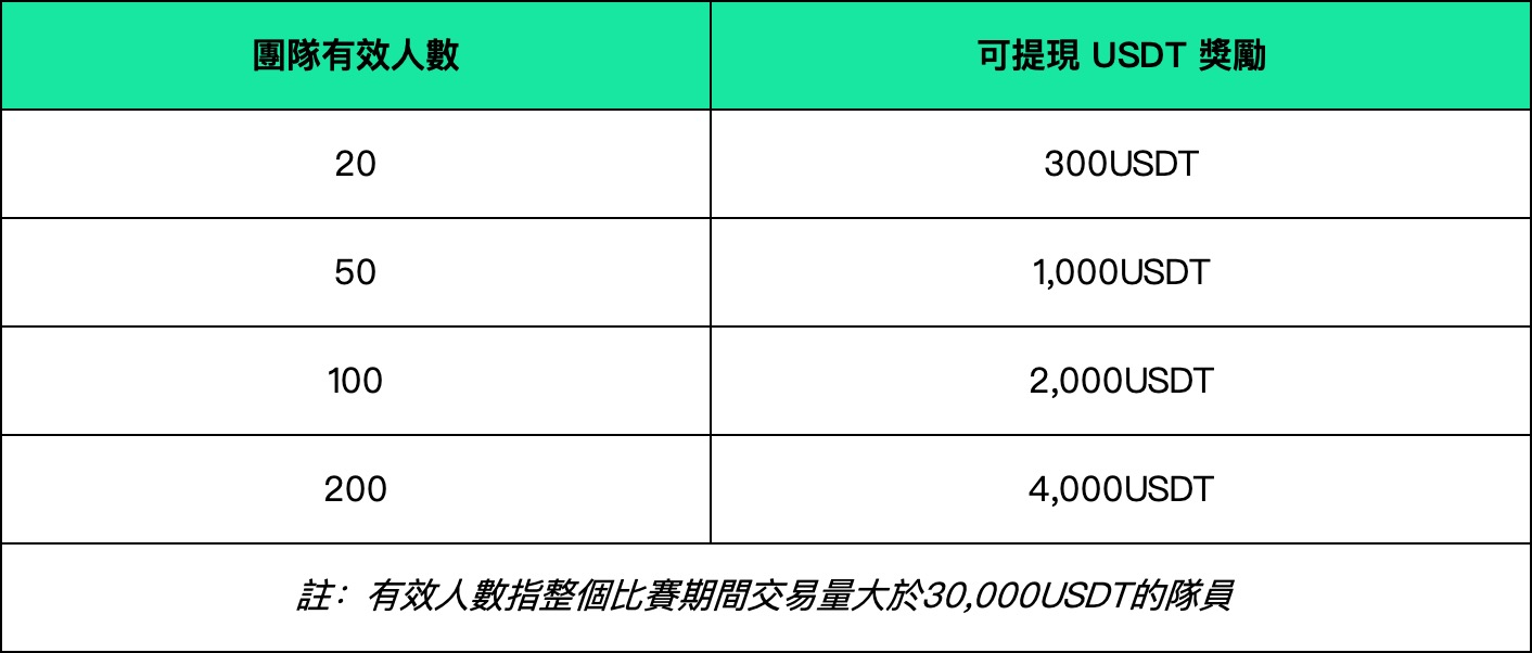 3. 活动期间,团队赛和个人赛获奖用户需满足正式比赛期间合约交易量≥3000USDT;团长贡献奖获得者,需满足有效交易人数,即比赛期间交易量>30,000USDT的队员数。