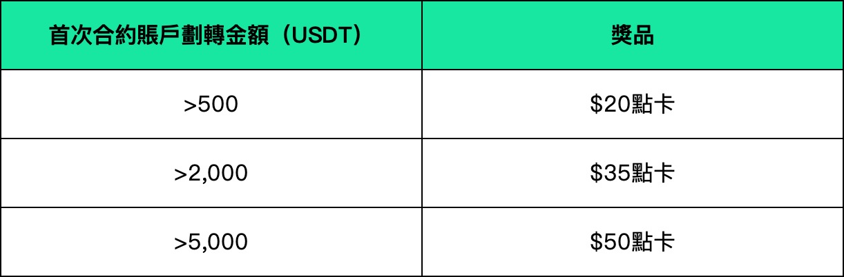 活動期間,老用戶進行合約交易,且合約纍計交易量不低於10,000USDT,交易量排名前500名的用戶將根據交易量佔比瓜分價值$30,000($5,000合約體驗金+$25,000點卡)獎勵。